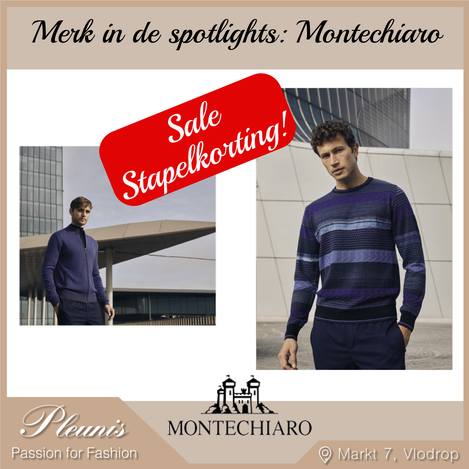 Bent u benieuwd naar de collectie van Montechiaro? Neem dan gerust contact met ons op via +31 (0)475 40 13 48 of modehuispleunis@hetnet.nl. U kunt ook het contactformulier op onze website invullen of een keer langskomen in onze gezellige en ruim opgezette winkel in het hart van Vlodrop.