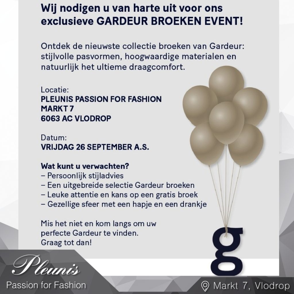 Wij nodigen je van harte uit voor ons exclusieve 𝐆𝐚𝐫𝐝𝐞𝐮𝐫 𝐁𝐫𝐨𝐞𝐤𝐞𝐧 𝐄𝐯𝐞𝐧𝐭! Ontdek de nieuwste collectie broeken van Gardeur in een gezellige en ongedwongen sfeer.